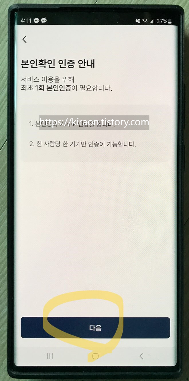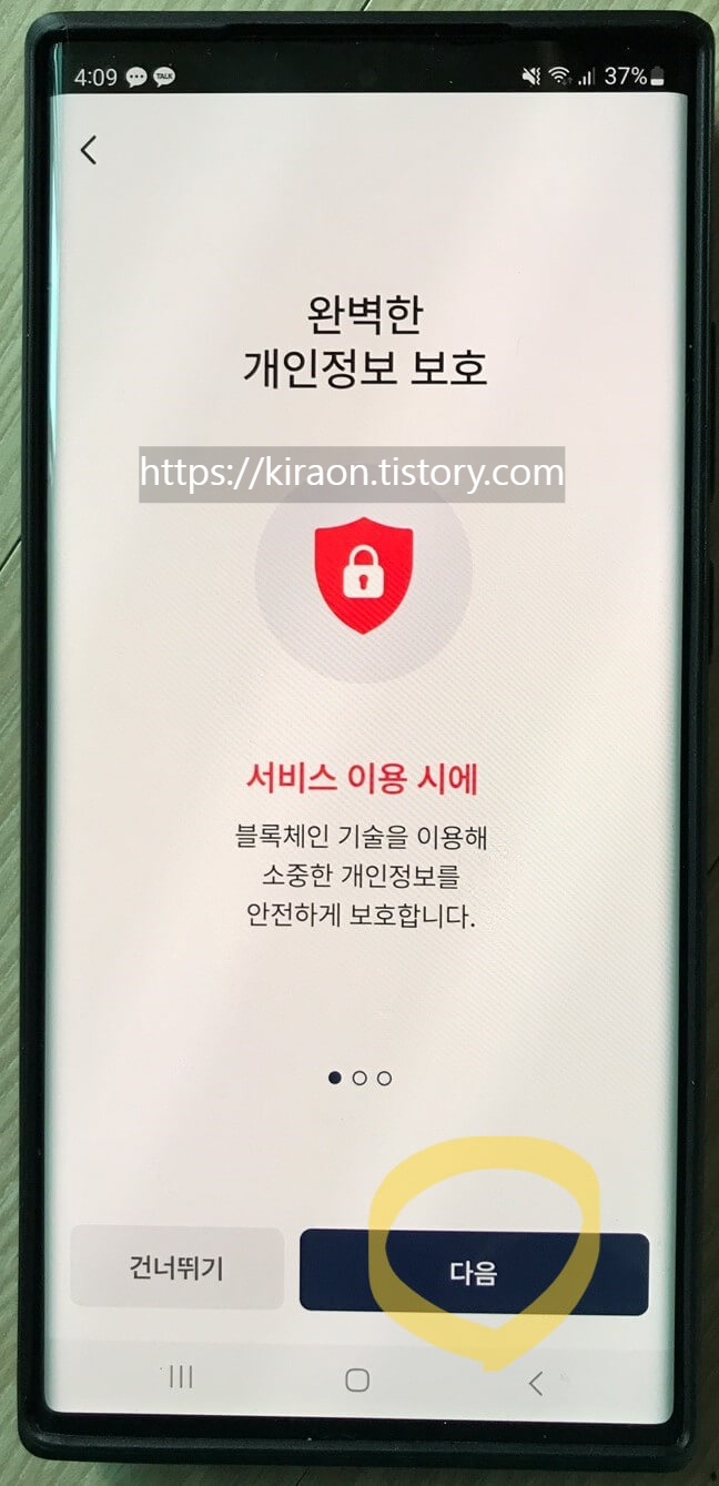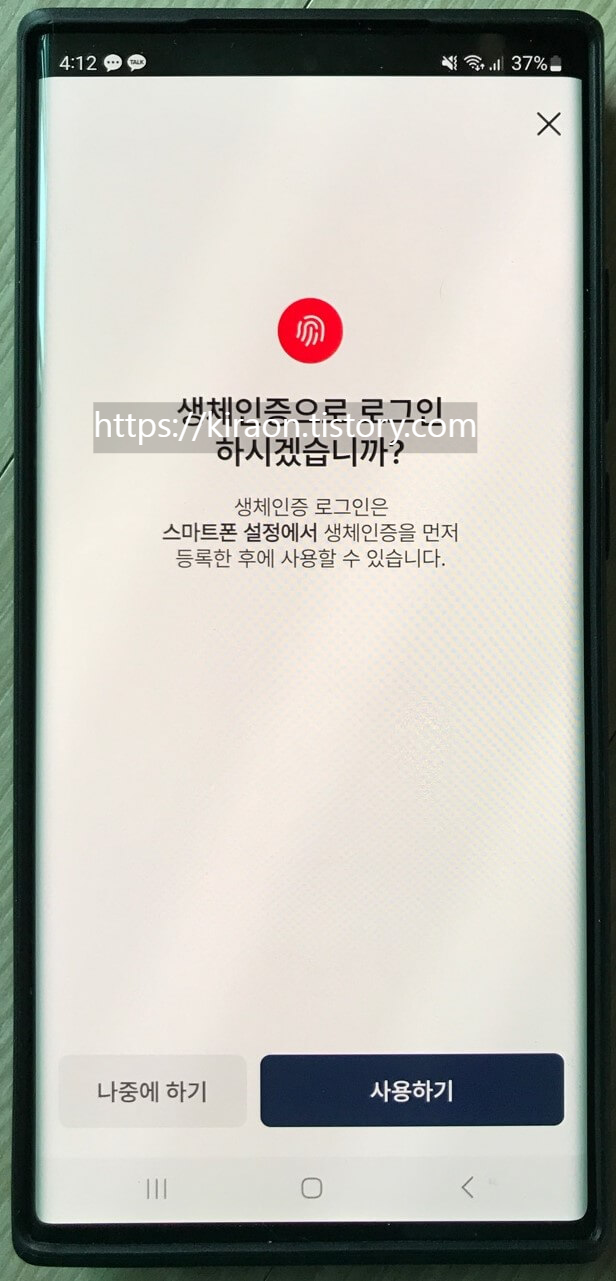 본인인증이 완료되었다면 생체인식 로그인이 나옵니다. 지문등록을 해도 되고 나중에 하기를 눌러도 됩니다.