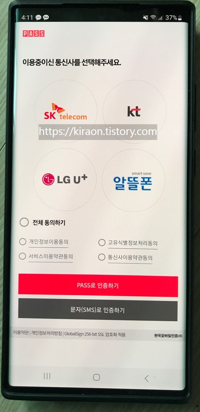 공인인증서 또는 핸드폰 본인인증을 선택할 수 있습니다. 모바일에 공인인증서가 있다면 공인인증서를 선택하시고 그렇지 않으면 핸드폰인증으로 본인인증합니다.