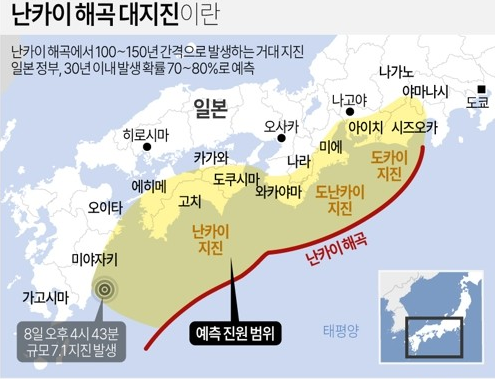 일본 규슈 남동부 미야자키현 앞바다에서 8일 오후 4시43분께 규모 7.1의 지진이 발생했다. 일본 정부는 이번 지진이 수십만 명의 희생자가 발생할 수도 있는 ‘난카이(남해) 해구 대지진’으로