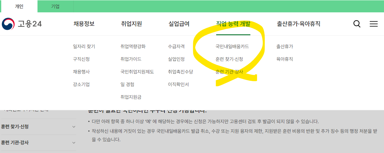 1. 고용24에서 내일배움카드 신청을 합니다.